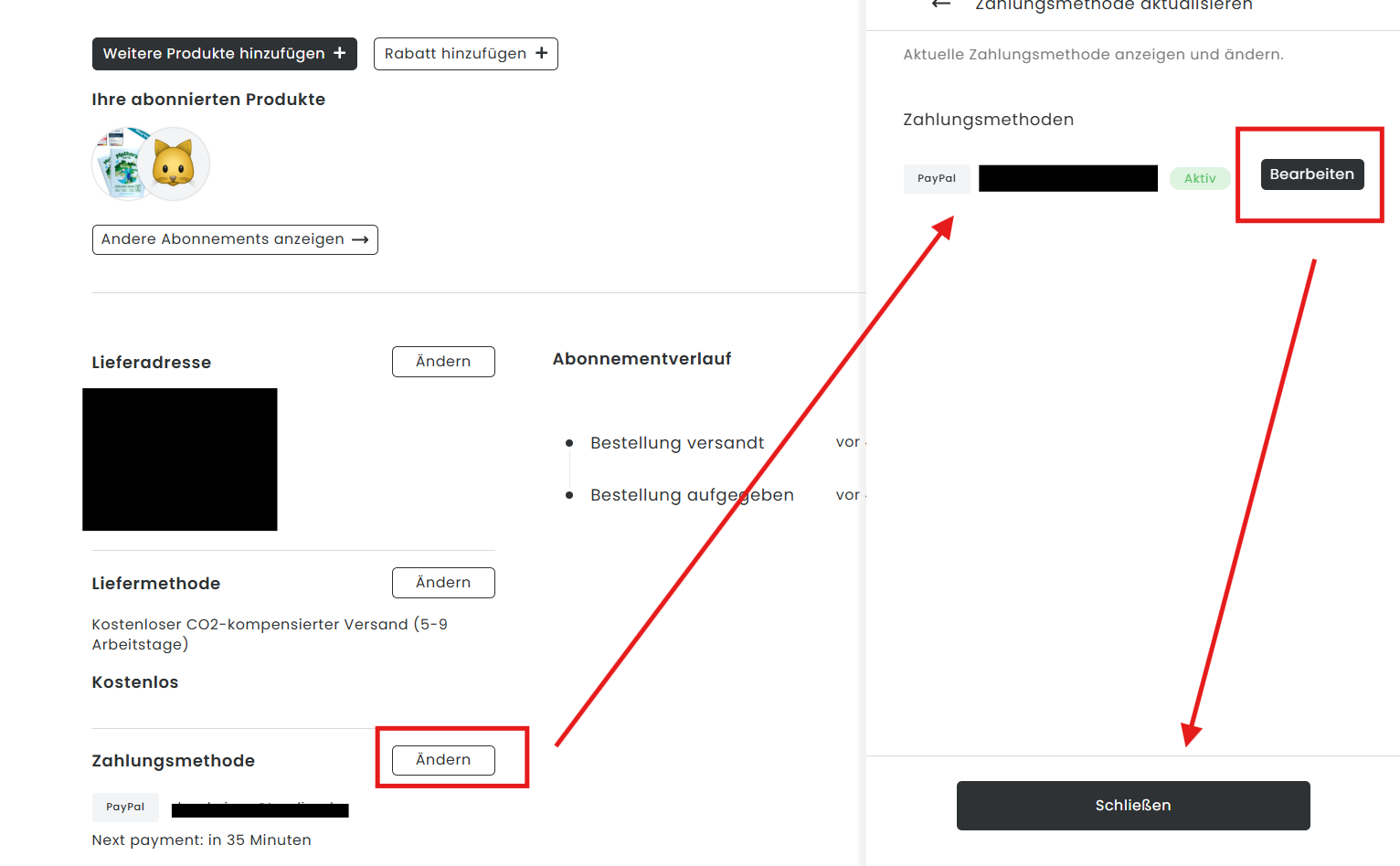 Klicke auf „Ändern“ neben „Zahlungsmethode“. Dann auf „Bearbeiten“, die gewünschte Änderung vornehmen und bestätigen.