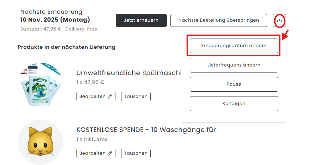 Klicke auf die drei Punkte und dann auf „Erneuerungsdatum ändern“.